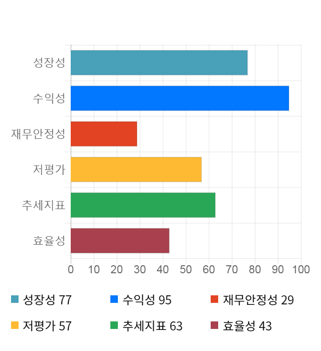 AI 인공지능 종목 분석 시스템을 이용해 성장성, 수익성, 효율성, 안전성, 저평가성, 추세 등 주가 수익률에 영향을 줄 수 있는 6가지 핵심 투자 지표를 점수화하여 종목의 투자 매력도를 계산해보았다.