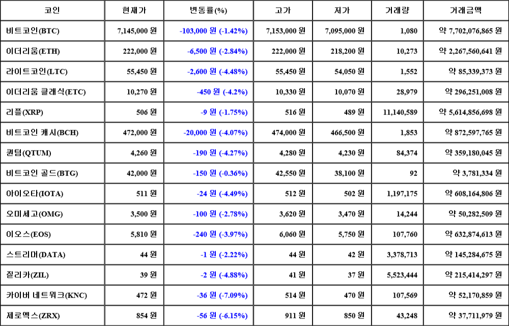 현재 암호화폐 거래소 "코인원"에 따르면 가상화폐 대장 격인 비트코인의 시세는 24시간 전 대비 103,000원(-1.42%) 하락한 7,145,000원에 거래되고 있다.