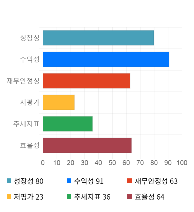 AI 인공지능 종목 분석 시스템을 이용해 성장성, 수익성, 효율성, 안전성, 저평가성, 추세 등 주가 수익률에 영향을 줄 수 있는 6가지 핵심 투자 지표를 점수화하여 종목의 투자 매력도를 계산해보았다.