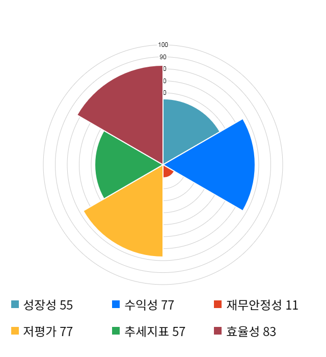 AI 인공지능 종목 분석 시스템을 이용해 성장성, 수익성, 효율성, 안전성, 저평가성, 추세 등 주가 수익률에 영향을 줄 수 있는 6가지 핵심 투자 지표를 점수화하여 종목의 투자 매력도를 계산해보았다.
