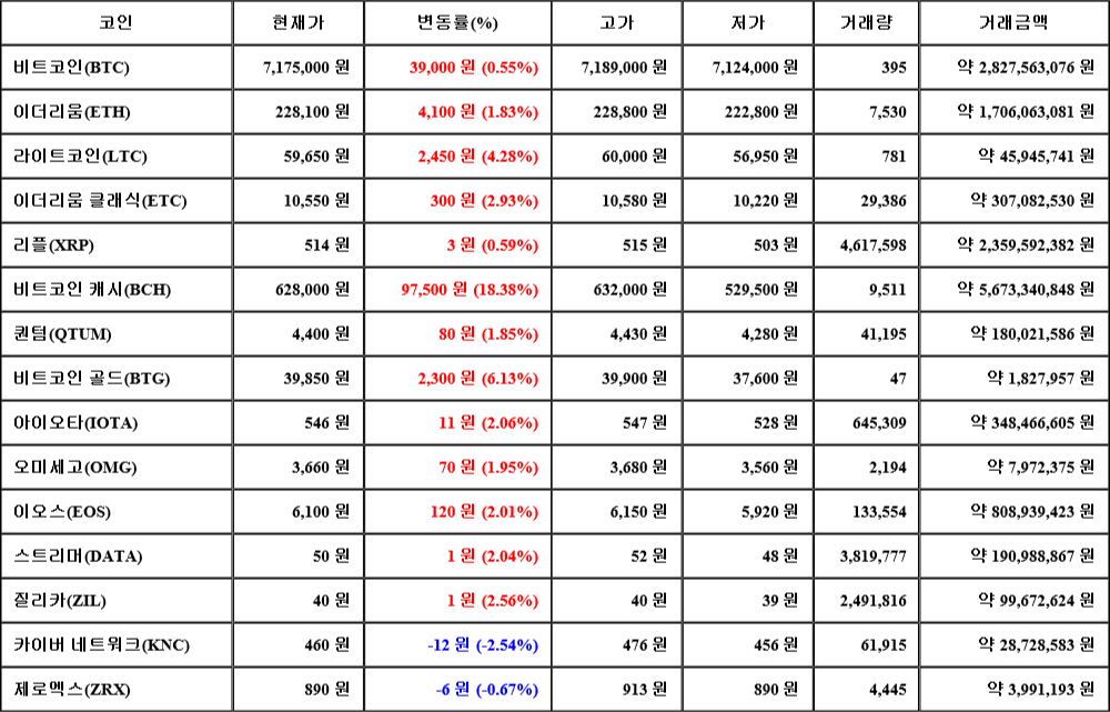 현재 암호화폐 거래소 "코인원"에 따르면 가상화폐 대장 격인 비트코인의 시세는 24시간 전 대비 39,000원(0.55%) 상승한 7,175,000원에 거래되고 있다.