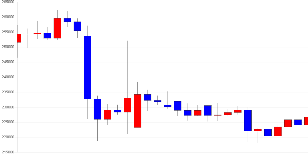 전일 대비 최저가는 222,800원, 최고가는 238,000원이었다. 1일 거래량은 5,670 ETH이며, 거래대금은 약 2,472,029,299원이었다.