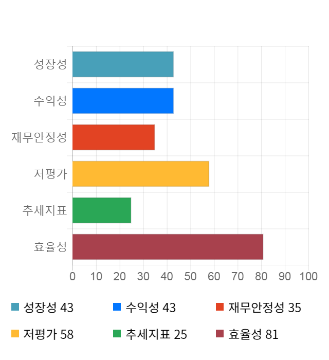 AI 인공지능 종목 분석 시스템을 이용해 성장성, 수익성, 효율성, 안전성, 저평가성, 추세 등 주가 수익률에 영향을 줄 수 있는 6가지 핵심 투자 지표를 점수화하여 종목의 투자 매력도를 계산해보았다.