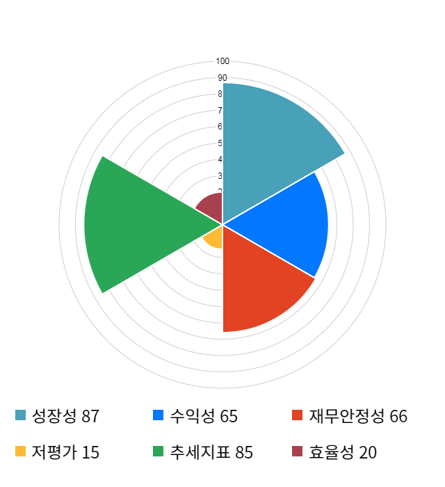 성장성 점수는 기업의 실적이 전년 동기 대비 얼마나 증가했는지를 나타낸 지표로 기업의 이익 성장 추세를 나타낸다.