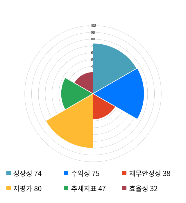 AI 인공지능 종목 분석 시스템을 이용해 성장성, 수익성, 효율성, 안전성, 저평가성, 추세 등 주가 수익률에 영향을 줄 수 있는 6가지 핵심 투자 지표를 점수화하여 종목의 투자 매력도를 계산해보았다.