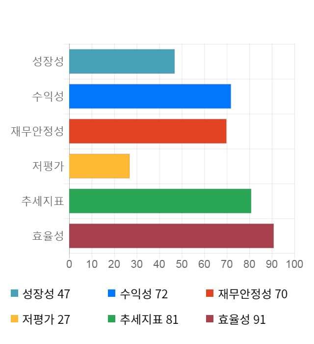 AI 인공지능 종목 분석 시스템을 이용해 성장성, 수익성, 효율성, 안전성, 저평가성, 추세 등 주가 수익률에 영향을 줄 수 있는 6가지 핵심 투자 지표를 점수화하여 종목의 투자 매력도를 계산해보았다.