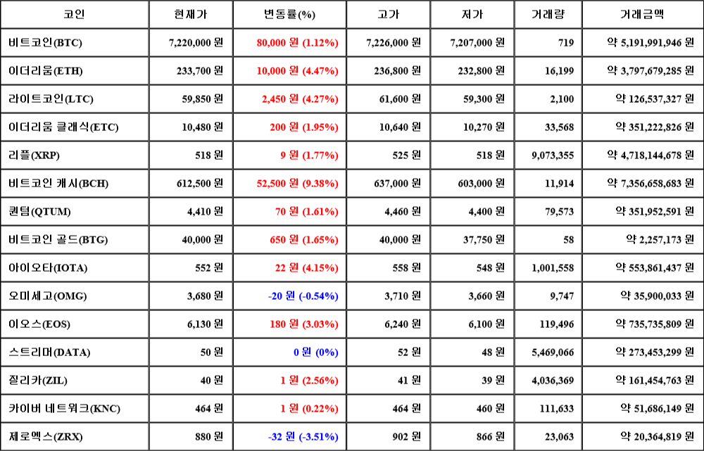 또한, 이더리움(4.47%, 233,700원), 라이트코인(4.27%, 59,850원), 아이오타(4.15%, 552원), 이오스(3.03%, 6,130원), 질리카(2.56%, 40원), 이더리움 클래식(1.95%, 10,480원), 리플(1.77%, 518원), 비트코인 골드(1.65%, 40,000원), 퀀텀(1.61%, 4,410원), 카이버 네트워크(0.22%, 464원)은 상승세를 나타냈다.