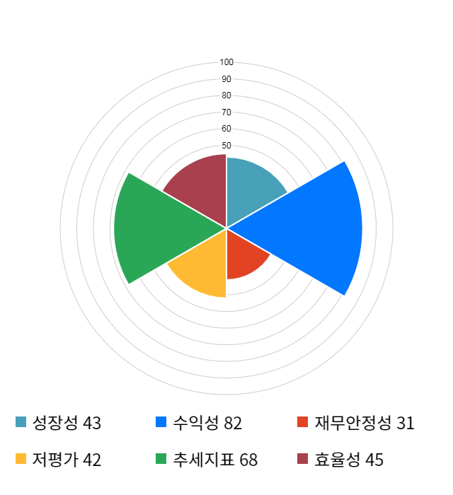 AI 인공지능 종목 분석 시스템을 이용해 성장성, 수익성, 효율성, 안전성, 저평가성, 추세 등 주가 수익률에 영향을 줄 수 있는 6가지 핵심 투자 지표를 점수화하여 종목의 투자 매력도를 계산해보았다.