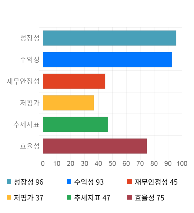 성장성 점수는 기업의 실적이 전년 동기 대비 얼마나 증가했는지를 나타낸 지표로 기업의 이익 성장 추세를 나타낸다.