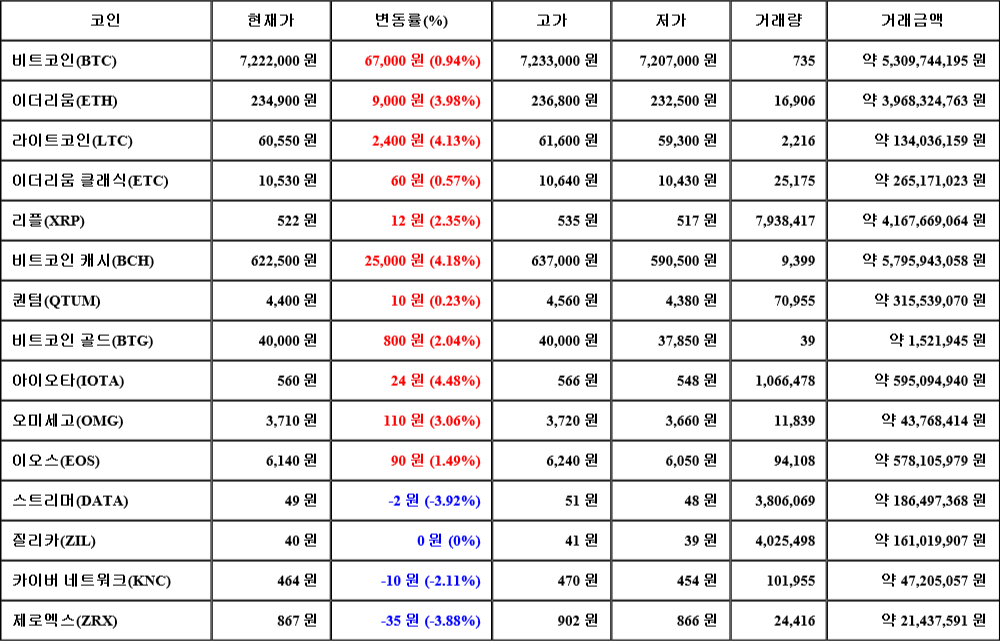 또한, 비트코인 캐시(4.18%, 622,500원), 라이트코인(4.13%, 60,550원), 이더리움(3.98%, 234,900원), 오미세고(3.06%, 3,710원), 리플(2.35%, 522원), 비트코인 골드(2.04%, 40,000원), 이오스(1.49%, 6,140원), 이더리움 클래식(0.57%, 10,530원), 퀀텀(0.23%, 4,400원)은 상승세를 나타냈다.