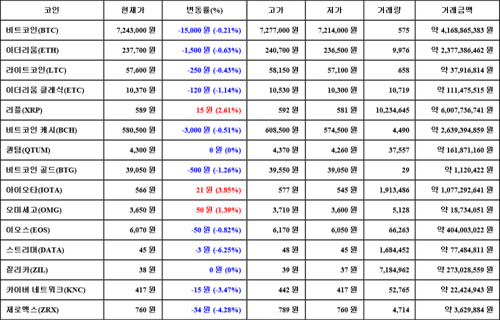 현재 암호화폐 거래소 "코인원"에 따르면 가상화폐 대장 격인 비트코인의 시세는 24시간 전 대비 15,000원(-0.21%) 하락한 7,243,000원에 거래되고 있다.