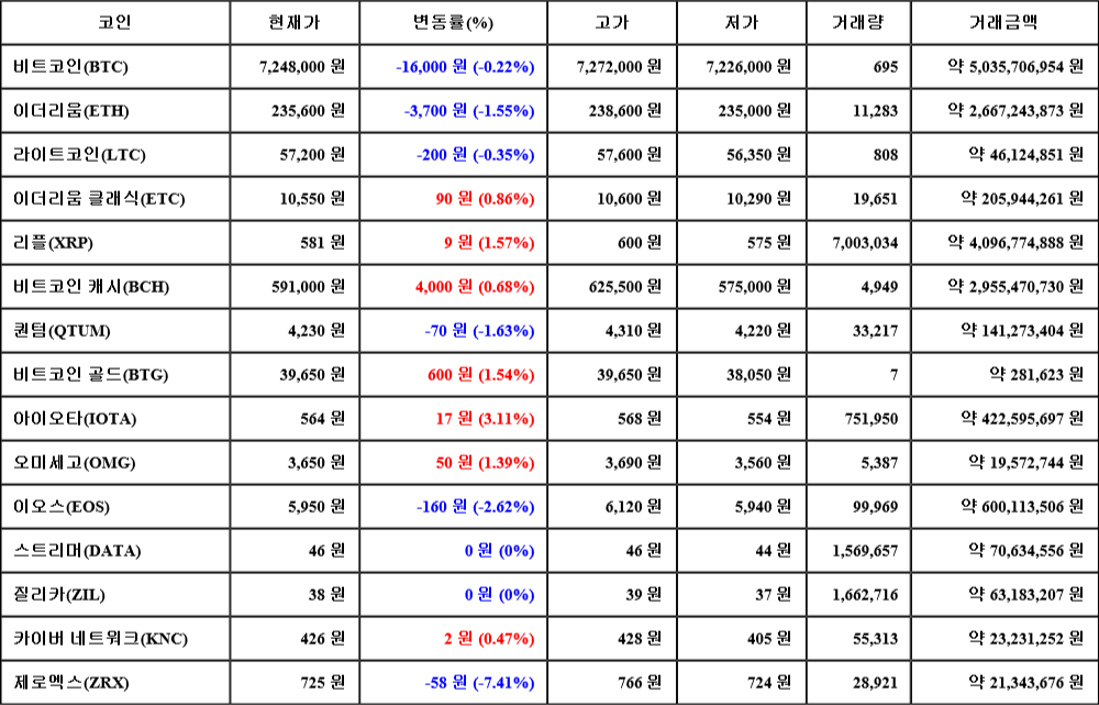 현재 암호화폐 거래소 "코인원"에 따르면 가상화폐 대장 격인 비트코인의 시세는 24시간 전 대비 16,000원(-0.22%) 하락한 7,248,000원에 거래되고 있다.
