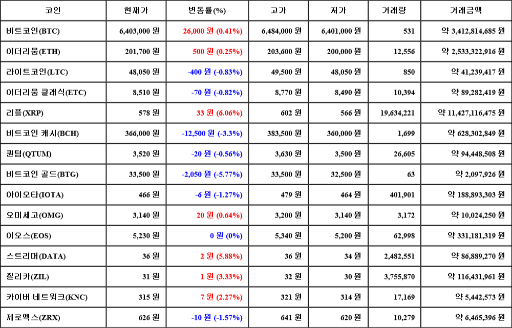 현재 암호화폐 거래소 "코인원"에 따르면 가상화폐 대장 격인 비트코인의 시세는 24시간 전 대비 26,000원(0.41%) 상승한 6,403,000원에 거래되고 있다.