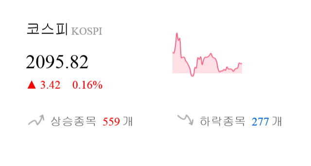 11월 19일 13시 0분 코스피는 전일 대비 3.42p(0.16%) 상승한 2095.82p를 기록하고 있다.