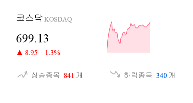 11월 19일 13시 0분 코스닥은 전일 대비 8.95p(1.3%) 상승한 699.13p를 기록하고 있다.