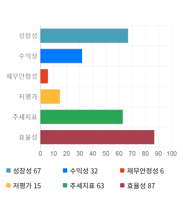 AI 인공지능 종목 분석 시스템을 이용해 성장성, 수익성, 효율성, 안전성, 저평가성, 추세 등 주가 수익률에 영향을 줄 수 있는 6가지 핵심 투자 지표를 점수화하여 종목의 투자 매력도를 계산해보았다.