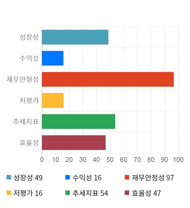 AI 인공지능 종목 분석 시스템을 이용해 성장성, 수익성, 효율성, 안전성, 저평가성, 추세 등 주가 수익률에 영향을 줄 수 있는 6가지 핵심 투자 지표를 점수화하여 종목의 투자 매력도를 계산해보았다.