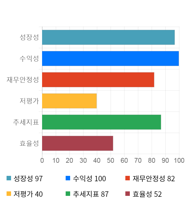 AI 인공지능 종목 분석 시스템을 이용해 성장성, 수익성, 효율성, 안전성, 저평가성, 추세 등 주가 수익률에 영향을 줄 수 있는 6가지 핵심 투자 지표를 점수화하여 종목의 투자 매력도를 계산해보았다.