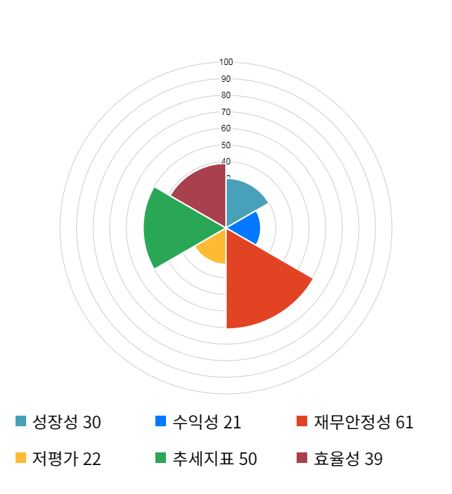 AI 인공지능 종목 분석 시스템을 이용해 성장성, 수익성, 효율성, 안전성, 저평가성, 추세 등 주가 수익률에 영향을 줄 수 있는 6가지 핵심 투자 지표를 점수화하여 종목의 투자 매력도를 계산해보았다.