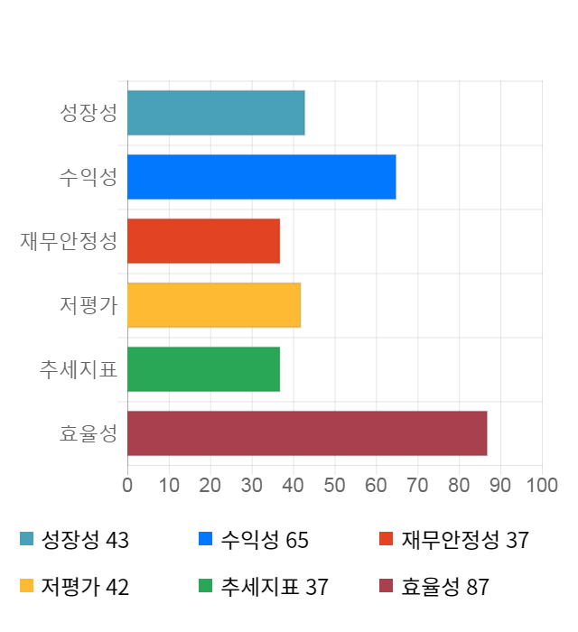 AI 인공지능 종목 분석 시스템을 이용해 성장성, 수익성, 효율성, 안전성, 저평가성, 추세 등 주가 수익률에 영향을 줄 수 있는 6가지 핵심 투자 지표를 점수화하여 종목의 투자 매력도를 계산해보았다.