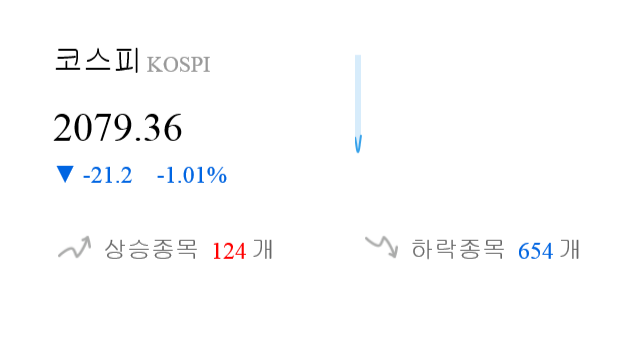 11월 20일 9시 10분 코스피는 전일 대비 21.2p(-1.01%) 큰 폭으로 하락한 2079.36p를 기록하고 있다.