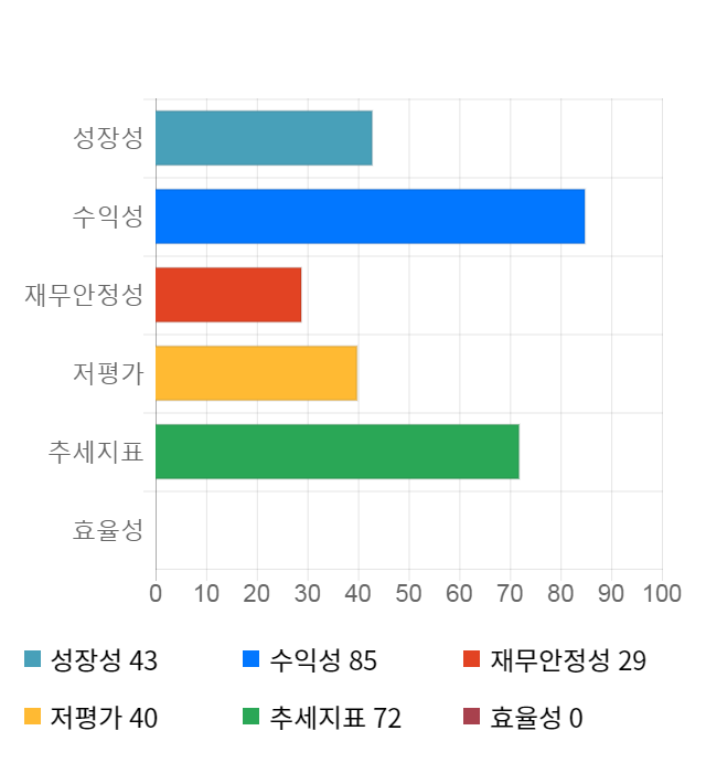 (위의 AI인공지능 점수는 재무 데이터를 기반으로 전체 상장 종목과 비교/분석하여 도출한 점수로 높은 점수가 반드시 높은 수익률을 보장하지 않습니다. 위의 자료는 당사의 추천 종목이 아니며, 투자 시 참고용으로 제시해드리는 것입니다. 핵심투자지표를 결합해 종목의 투자매력도를 종합 계산한 "인공지능 투자점수"는 "거장들의 투자공식" 앱에서 확인하실 수 있습니다.)