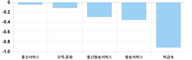 반면, 디지털컨텐츠(-0.01%), 기계,장비(-0.02%), 금속(-0.04%), 건설(-0.04%), 통신서비스(-0.05%), 오락,문화(-0.12%), 통신방송서비스(-0.3%), 방송서비스(-0.36%), 비금속(-0.92%) 등은 하락세를 나타냈다.