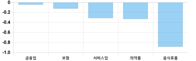 반면, 비금속광물(-0.02%), 섬유의복(-0.03%), 금융업(-0.05%), 보험(-0.13%), 서비스업(-0.32%), 의약품(-0.34%), 음식료품(-0.89%) 등은 하락세를 나타냈다.