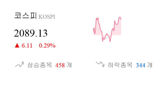 11월 27일 12시 0분 코스피는 전일 대비 6.11p(0.29%) 상승한 2089.13p를 기록하고 있다.