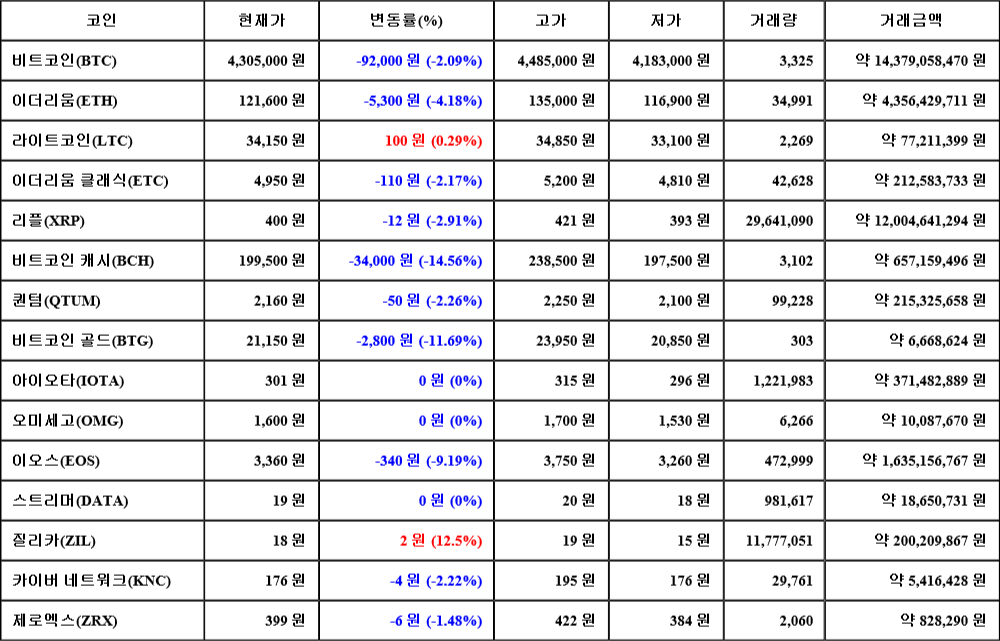 현재 암호화폐 거래소 "코인원"에 따르면 가상화폐 대장 격인 비트코인의 시세는 24시간 전 대비 92,000원(-2.09%) 하락한 4,305,000원에 거래되고 있다.