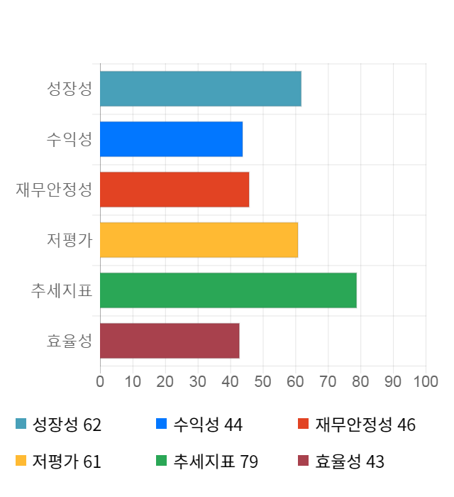 AI 인공지능 종목 분석 시스템을 이용해 성장성, 수익성, 효율성, 안전성, 저평가성, 추세 등 주가 수익률에 영향을 줄 수 있는 6가지 핵심 투자 지표를 점수화하여 종목의 투자 매력도를 계산해보았다.