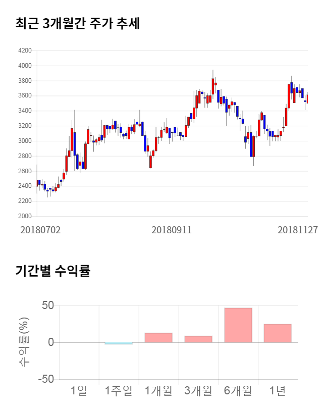 [그림 1] 최근 3개월 간 주가 추세 및 기간별 수익률