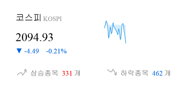 11월 28일 11시 0분 코스피는 전일 대비 4.49p(-0.21%) 하락한 2094.93p를 기록하고 있다.