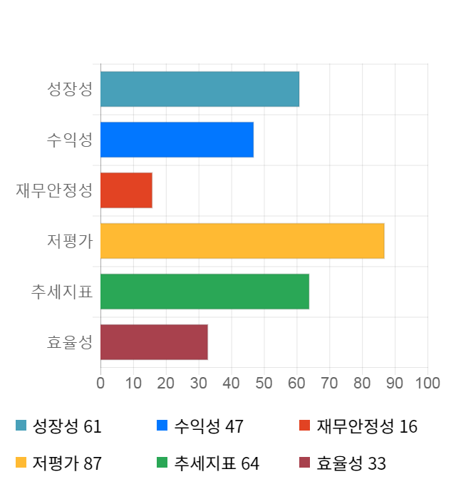AI 인공지능 종목 분석 시스템을 이용해 성장성, 수익성, 효율성, 안전성, 저평가성, 추세 등 주가 수익률에 영향을 줄 수 있는 6가지 핵심 투자 지표를 점수화하여 종목의 투자 매력도를 계산해보았다.