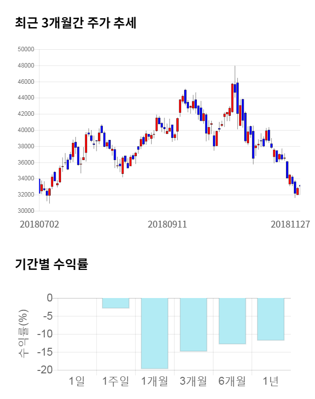 [그림 1] 최근 3개월 간 주가 추세 및 기간별 수익률