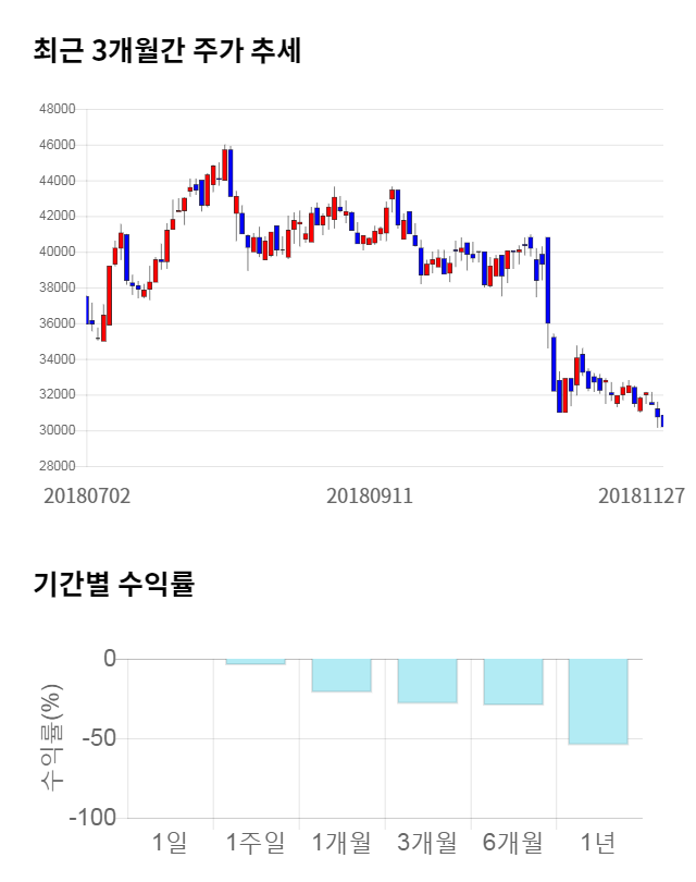 주가 모멘텀은 좋지 못했다. 최근 6개월 수익률은 -29.52%의 하락폭을 기록했다. 최근 1개월 수익률 또한 -21.35% 하락하며 부진한 모멘텀을 이어가고 있다.