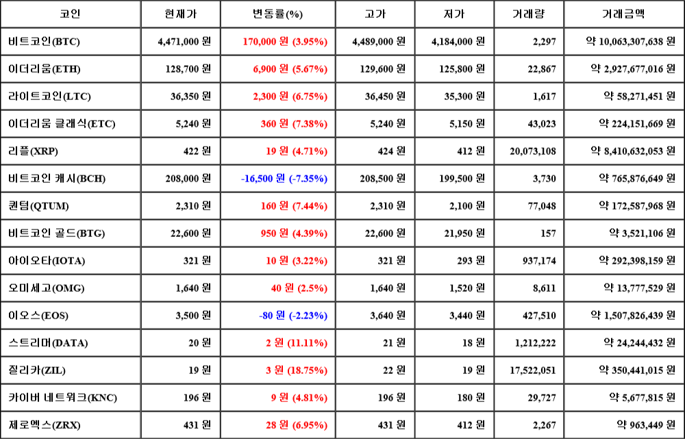 또한, 스트리머(11.11%, 20원), 퀀텀(7.44%, 2,310원), 이더리움 클래식(7.38%, 5,240원), 제로엑스(6.95%, 431원), 라이트코인(6.75%, 36,350원), 이더리움(5.67%, 128,700원), 카이버 네트워크(4.81%, 196원), 리플(4.71%, 422원), 비트코인 골드(4.39%, 22,600원), 아이오타(3.22%, 321원), 오미세고(2.5%, 1,640원)은 상승세를 나타냈다.