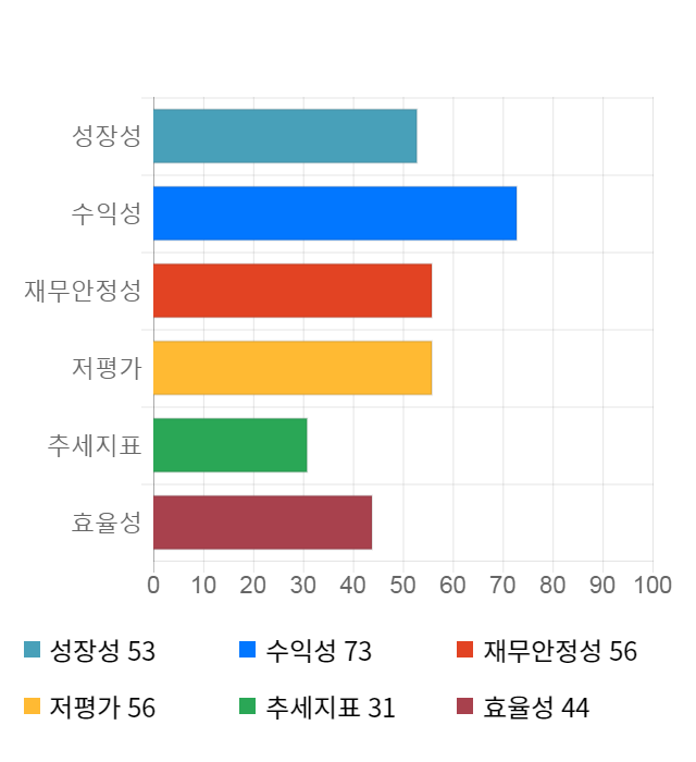 AI 인공지능 종목 분석 시스템을 이용해 성장성, 수익성, 효율성, 안전성, 저평가성, 추세 등 주가 수익률에 영향을 줄 수 있는 6가지 핵심 투자 지표를 점수화하여 종목의 투자 매력도를 계산해보았다.