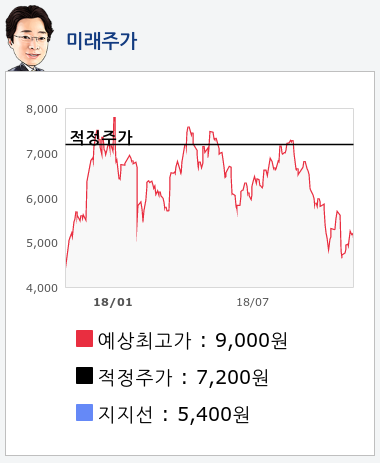 알파고의 재무데이터 분석 결과에 따르면 적정주가는 7,200원을 예상하고 있으며, 목표주가는 9,000원, 지지선은 5,400원 으로 예상하고 있다.