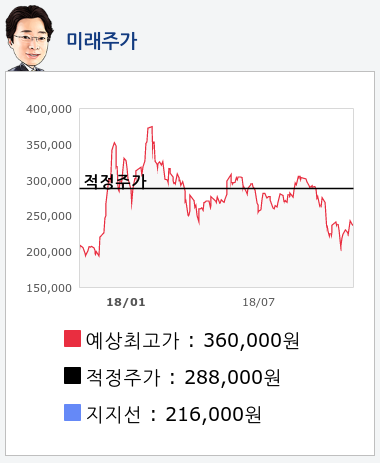 알파고의 재무데이터 분석 결과에 따르면 적정주가는 288,000원을 예상하고 있으며, 목표주가는 360,000원, 지지선은 216,000원 으로 예상하고 있다.
