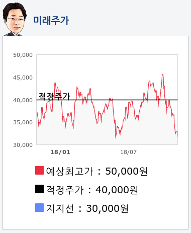 알파고의 재무데이터 분석 결과에 따르면 적정주가는 40,000원을 예상하고 있으며, 목표주가는 50,000원, 지지선은 30,000원 으로 예상하고 있다.