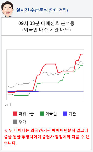 알파고가 분석한 펩트론 종목의 외국인·기관 당일 실시간 수급은 현재 외국인은 매수하고 있고 기관은 매도하고 있으며, 종합 수급분석 평가지표인 파워수급은 09시 00분 부터 현재까지 추정이 불가한 것으로 분석하고 있다.