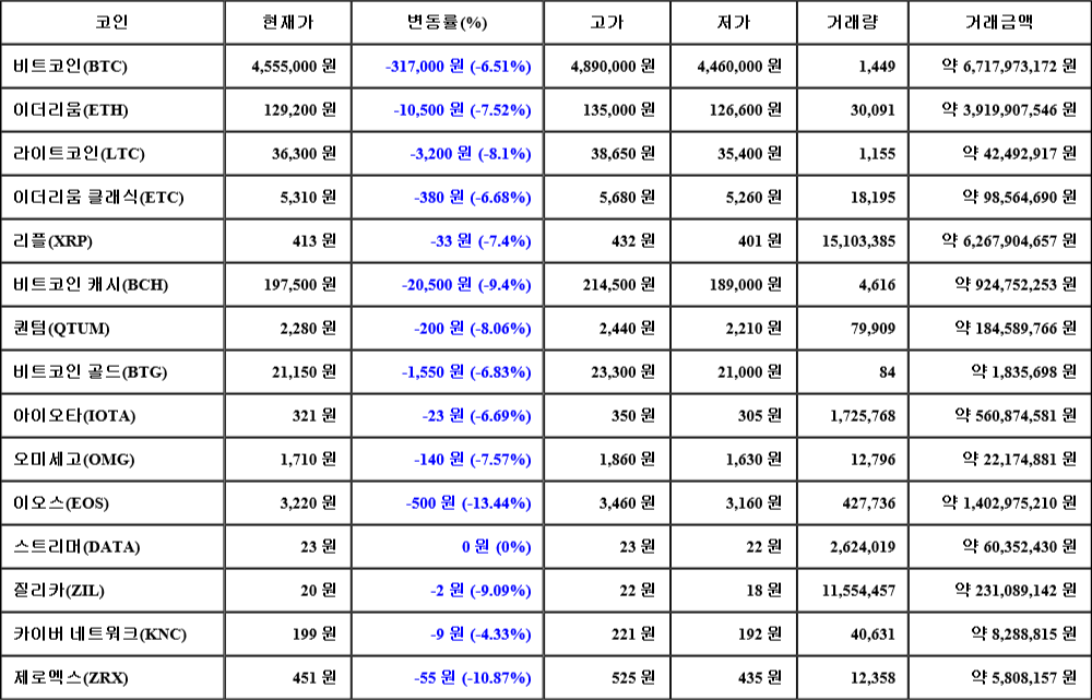 현재 암호화폐 거래소 "코인원"에 따르면 가상화폐 대장 격인 비트코인의 시세는 24시간 전 대비 317,000원(-6.51%) 하락한 4,555,000원에 거래되고 있다.