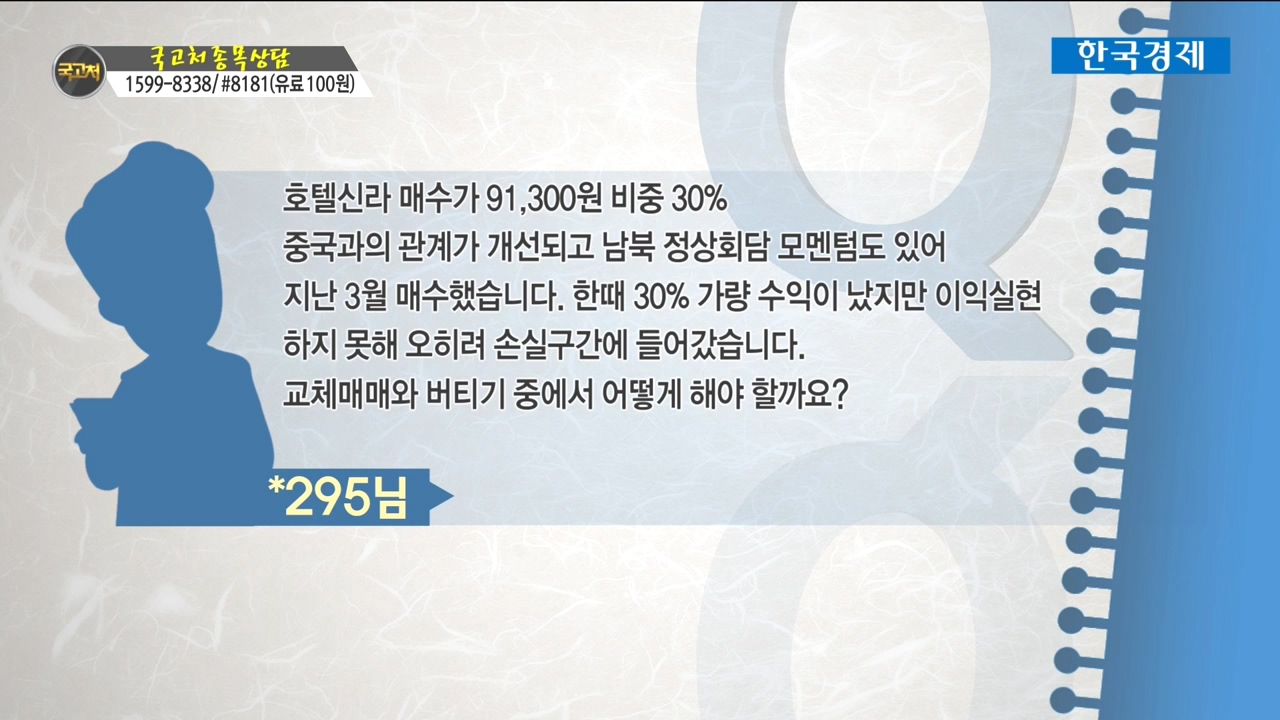 [국고처 최승욱] 종목상담 - 호텔신라(008770)12월 01일 방송된 '국민주식고충처리반'에 출연한 최승욱파트너가 호텔신라(008770)에 대한 시세와 전망을 이야기하고 있다.▶대한민국 대표 증권방송 '국민주식고충처리반' 매주 토 오전 9시스마트폰 앱 '주식창'에 시청자 의견 남겨주세요.