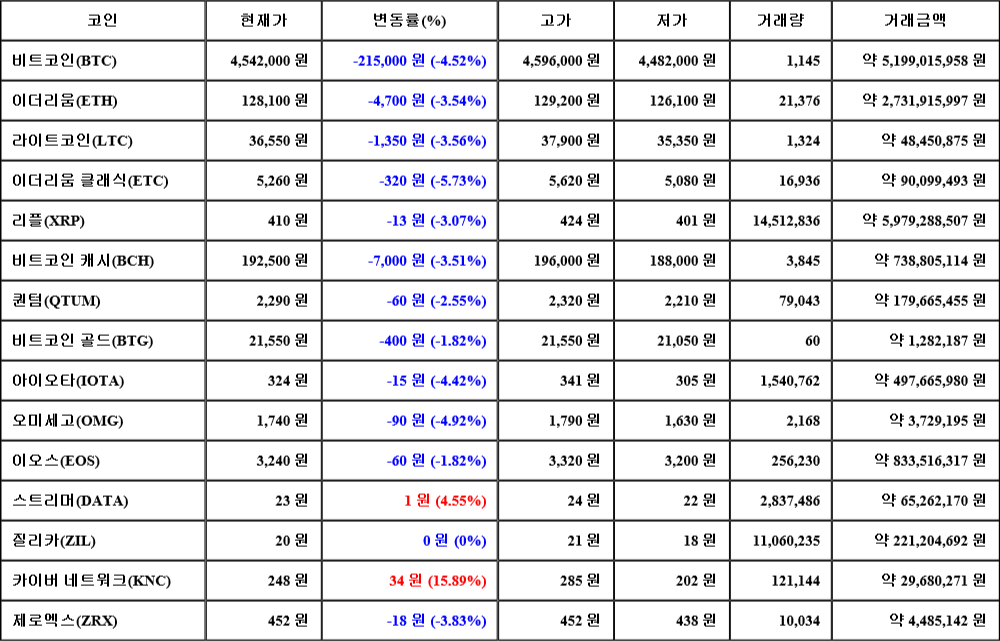 현재 암호화폐 거래소 "코인원"에 따르면 가상화폐 대장 격인 비트코인의 시세는 24시간 전 대비 215,000원(-4.52%) 하락한 4,542,000원에 거래되고 있다.