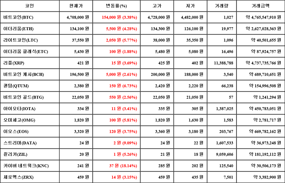 현재 암호화폐 거래소 "코인원"에 따르면 가상화폐 대장 격인 비트코인의 시세는 24시간 전 대비 154,000원(3.38%) 상승한 4,708,000원에 거래되고 있다.