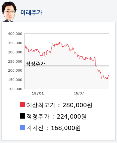 알파고의 재무데이터 분석 결과에 따르면 적정주가는 224,000원을 예상하고 있으며, 목표주가는 280,000원, 지지선은 168,000원 으로 예상하고 있다.