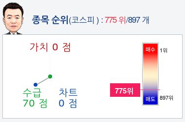 알파고가 가치, 수급, 차트로 평가한 남선알미우종목의 현재 종합순위는 코스피 897개 종목 중 777위로, 알파고는 남선알미우기업의 차트을 높게 평가 분석하고 있다.