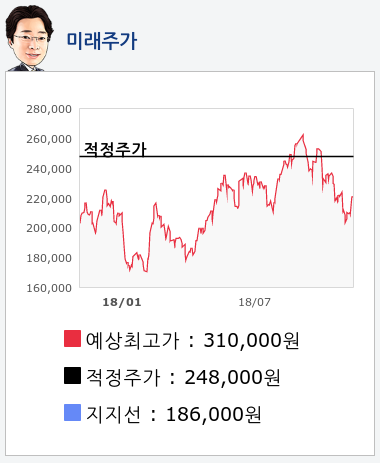 알파고의 재무데이터 분석 결과에 따르면 적정주가는 248,000원을 예상하고 있으며, 목표주가는 310,000원, 지지선은 186,000원 으로 예상하고 있다.