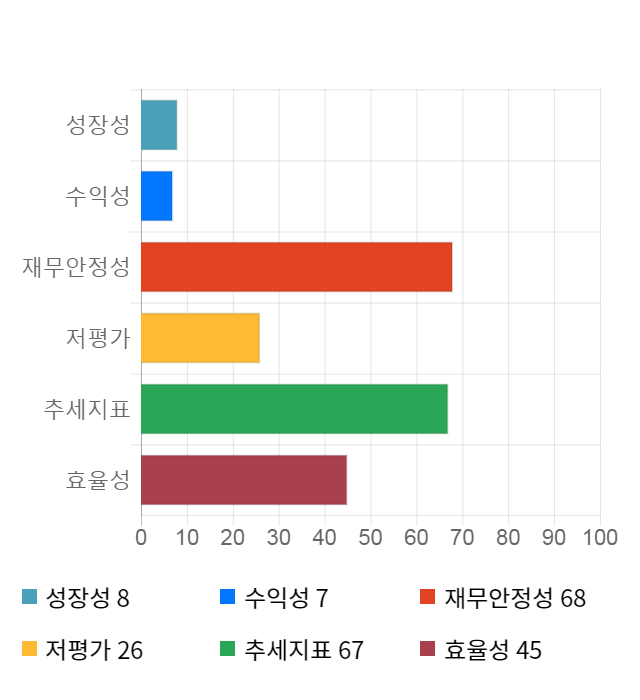 AI 인공지능 종목 분석 시스템을 이용해 성장성, 수익성, 효율성, 안전성, 저평가성, 추세 등 주가 수익률에 영향을 줄 수 있는 6가지 핵심 투자 지표를 점수화하여 종목의 투자 매력도를 계산해보았다.